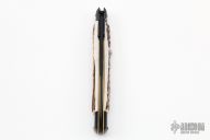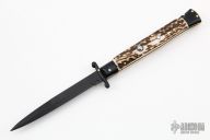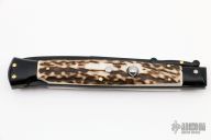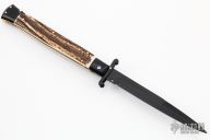 This 11" Swing Guard Auto by Frank Beltrame features a black bayonet ground blade with false top edge. The handle has black stainless steel bolsters, front and rear, stag scales, brass liners, black stainless spring. Excellent condition.