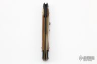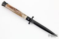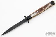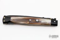 This 11" Swing Guard Auto by Frank Beltrame features a black bayonet ground blade with false top edge. The handle has black stainless steel bolsters, front and rear, honey horn scales, brass liners, black stainless spring. Excellent condition.