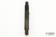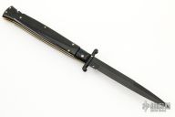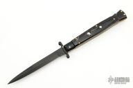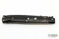 This 11" Swing Guard Auto by Frank Beltrame features a black bayonet ground blade with false top edge. The handle has black stainless steel bolsters, front and rear, buffalo horn scales, brass liners, black stainless spring. Excellent condition.