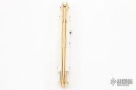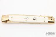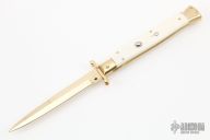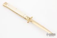 This 11" Swing Guard Auto by Frank Beltrame features a gold-plated bayonet ground blade with false top edge. The handle has gold-plated stainless steel bolsters, front and rear, imitation ivory scales, brass liners, gold-plated stainless spring. Excellent Condition.