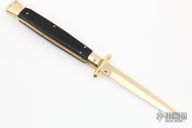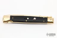 This 11" Swing Guard Auto by Frank Beltrame features a gold-plated bayonet ground blade with false top edge. The handle has gold-plated stainless steel bolsters, front and rear, black wood scales, brass liners, gold-plated stainless spring. Excellent Condition.