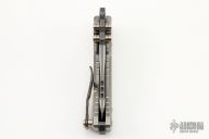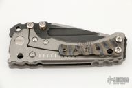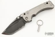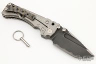 This Custom T-1 Folder by Miller Brothers Blades features a Z-Wear PM tanto blade with fullers, notched thumbrest and double dual thumbstuds. The handle has a milled and stonewashed titanium frame, tip up clip and a steel backspacer. Stainless steel lockface insert. Comes with a pin that can be inserted into the handle when open to lock the blade in the open position. Comes with original Pelican case and COA. New from maker!