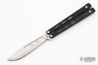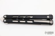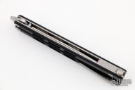The BlackCELL is Brous Blades' second venture into the balisong market. Jason has spent many months perfecting the look and feel of the knife to achieve a satisfying action. The D2 blade rides on a bushing and washer system to provide a smooth flipping action without compromising strength. In order to reduce and balance the weight of the knife, he strategically milled cut outs into the blade and handles. The milled cutouts also give the knife a unique look and provide added grip as well as purposed placed weight on the opposite ends of the knife for supreme flipping momentum. The BlackCELL also features titanium liners with 3D machined black G10 scales. The strategically placed pocket clip is located on the bite handle, allowing you to carry it in either pocket without the need to swap it from one side to the other. The BlackCELL is a great addition to any knife collection whether you can flip or not.