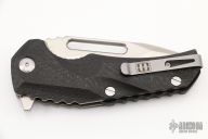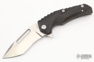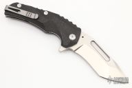Introducing The New Reloader Flipper, A collaborative design between custom Knifemakers Jason Brous and Mikkel Willumsen. The satin etched D2 steel blade features a unique main hollow grind with a flat ground tanto style tip and a thick secondary swedge on each side. The Reloader utilizes an integrated flipper for quick blade deployment on a ball bearing pivot system. The handle scales are made from carbon fiber with custom milled grooves for a secure and comfortable grip. The titanium liner lock is carbidized with tungsten carbide which provides a harder lock face surface and eliminates stickiness. The knife can be deployed either with the flipper tang or manually with the groove cut out in the blade. With stainless steel hardware and a reversible, deep set, tip up pocket makes this knife a great affordable every day carry blade. Comes with original box and papers. Knife is in Excellent condition, shows no signs of use/carry.