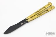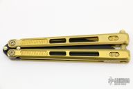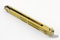This Trident Balisong by Elite Outfitting Solutions features a black blade with fullers. The handle features a gold titanium frame anodized titanium hardware. Includes a matching T-latch. Comes with original box. Excellent condition.