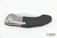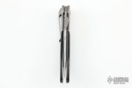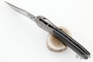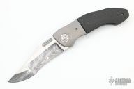 This Pirate linerlock folder by Allen Elishewitz features a two-tone Damascus blade with single thumbstud. The handle has bead blast titanium bolsters, carbon fiber scales, titanium liners, black G-10 backspacer, bead blast stainless steel clip. Smooth action. Perfect blade seating and lockup. Excellent condition.