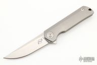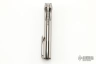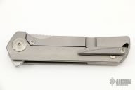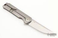 This Warrior 1 by Reate Knives is a Liong Mah design, it features a tumbled drop point blade with a notched thumbrest.  The handle has a milled and blasted titanium frame, blasted titanium backspacer with tritium and tip up blasted titanium clip. Rides on bearings. Nice detent, lockup and blade seating.  Includes a padded zippered case.  Excellent Condition.