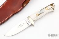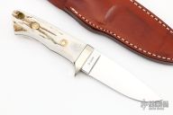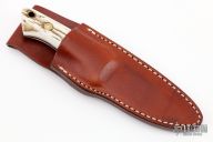 This Loveless Design Oregon Speical by G Sakai features a mirror polished blade with notched thumbrest, .184" blade stock and 1.069" blade depth, full tapered tang construction. The handle has a nickel silver guard, stag scales, lanyard hole at the butt. Comes with brown leather sheath and original box. Has some light patina/scratches, otherwise excellent condition.