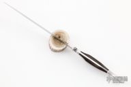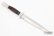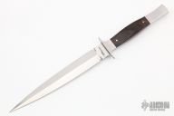 This dagger by Joe Knipstein features a dagger style blade with an integral construction. .153" Blade Stock. .977" Blade Depth. The handle has wood scales. Excellent Condition.