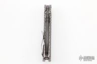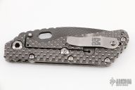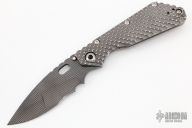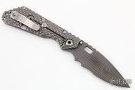 This SMF DGG by Mick Strider has a grid coated nightmare ground blade with dual thumb studs, thumbhole, and notched thumbrest. The handle has a double Gunner Grip titanium frame, with lockbar stabilizer, and titanium tip up clip, left right reversible. Excellent condition. Includes padded zippered SOE case.  Nice detent, lockup and blade seating.