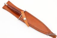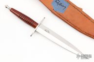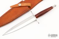 This Dagger by Gene Langley features a mirror polished dagger style blade with a hidden tang construction.  .193" Blade Stock.  1.165" Blade Depth.  The handle features a steel guar and butt with a wood scale.  Includes a brown leather sheath.  Excellent Condition.