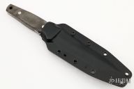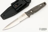 This CQB1 is a Bob Terzuola design executed by Camillus. It features a satin finished partially serrated blade with false top edge, notched thumb ramp, .164" blade stock and 1.351" blade depth, full tang construction. The handle is comprised of green canvas micarta scales with lanyard hole over notched tang. Includes kydex sheath with Tek-Lok, original box. Has a few light spots on the blade, otherwise excellent condition.