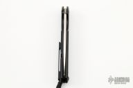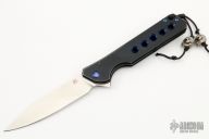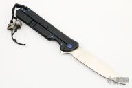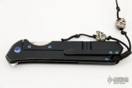 This Rainmaker by Olamic Cutlery features a satin finished blade with a notched flipper. The handle has a black Gunkote titanium frame with blue anodized accents, matching titanium tip up pocket clip and titanium floating backspacer. Nice detent, blade seating and lock up. Includes original zippered case and COA dated 6-21-19. Has some scuffs,  otherwise excellent condition.