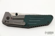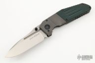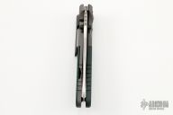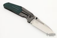 This MLK D/A by Benchmade is a Shane Sibert design, it features a tumble finished blade with dual thumbstuds, and a notched thumbrest. The handle has a bead blasted titanium frame with green G-10 scales, a black stainless steel liner, and black barrel spacers. Comes with a zippered case. #89 on blade. Excellent condition.