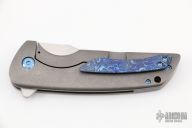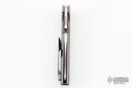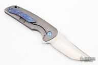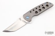 This Hokkaido by John Barker features a hand rub satin finished tanto blade with notched thumbrest and flipper. The handle has a tumble finished titanium frame, mokuti tip up clip and Damascus backspacer. Rides on bearings, nice detent, lockup and blade seating. Comes with a velcro pouch. Excellent condition.