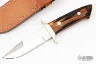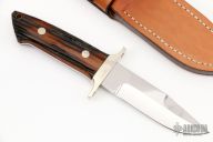 This knife by Koji Hara features a mirror polished laminated steel blade with sharpened top edge, .195" blade stock and 1.173" blade depth, full tapered tang construction. The handle is comprised of a nickel silver guard and stag scales with red liners. Includes a brown leather sheath. Excellent condition. Comes with a zippered case.