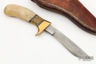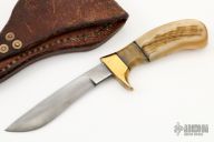 This Fawn by Butch Deveraux features a drop point blade with visible temper line, .171" blade stock and .717" blade depth, hidden tang construction. The handle has a brass guard with sheep horn grip and black spacers. Comes with a brown leather sheath. Excellent condition. Dated '10. Butch studied under Ed Fowler and is a graduate of the High Performance Blade School.