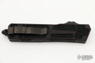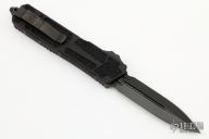 The Microtech Scarab II is a high quality tactical out-the-front knife, based on the original Microtech Ultratech design. Built to withstand the extreme, the Scarab II excels in high-intensity covert operations. The Scarab II is designed for a broad spectrum of utility and close quarter combat applications for use by qualified law enforcement, military, and government agency operatives. The Scarab II is fabricated to the highest possible standards to assure reliability and safety with its use. Featuring a one-handed, open and close, dual-action out-the-front (OTF) design, and double edge blade. The Scarab is produced with a large easy-to-grip handle that contains non-slip grip inlays on both sides. Comes with original box and papers. Has a scratch on the clip, otherwise excellent condition.