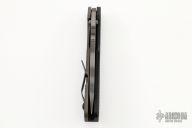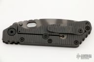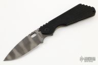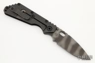 This SMF framelock folder by Mick Strider features a tiger striped drop point blade and a dimple pattern black aluminum and flamed titanium frame and tip up titanium clip. Includes a "Lock Bar Stabilizer" for maximum reverse lock retention. Nice detent, lockup and blade seating. Excellent condition.