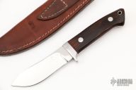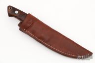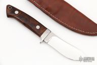 This knife by Richard A. Rotella features a mirror polished blade with .203" Blade Stock and 1.209" Blade Depth, full tapered tang construction. The handle is comprised of a stainless steel guard and desert ironwood scales over red liners. Lanyard tube in pommel. Includes brown leather sheath and a zippered case. Has some scratches and a stain on the blade, otherwise excellent condition. #091