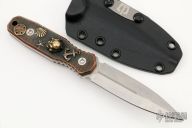 This Dagger by Blackside Customs features a stonewashed double edged blade with fullers, .101" blade stock and .860" blade depth, full tang construction. The handle has custom copper scales with brass embellishments done by Ryk Maverick. Comes with a kydex sheath with logo plate and Ulti-Clip, original box and COA dated "One of a Kind 2022". Excellent condition.