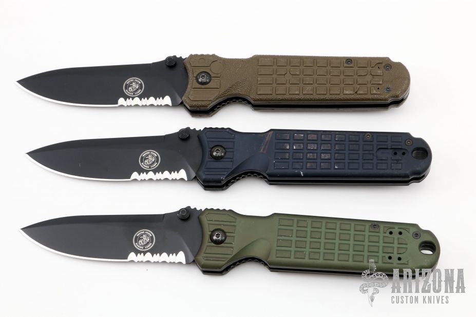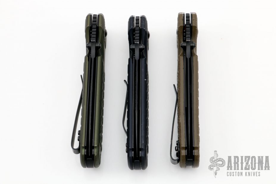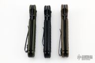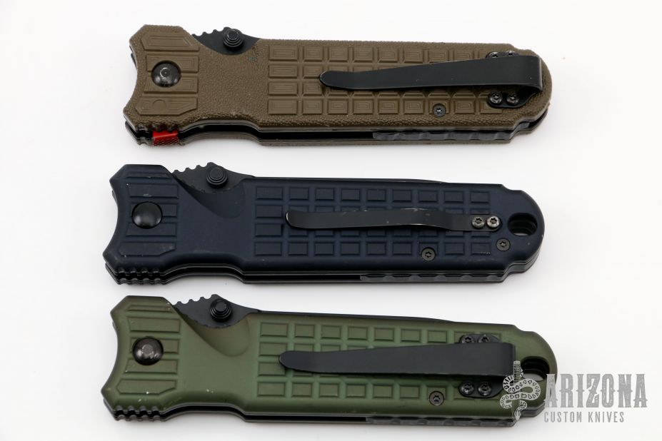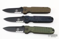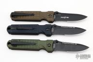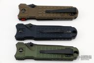 The LAWKS safety system prevents blade movement and the liners are a great thickness for even more security. The semi-closed back construction provides greater stability for the blade, and the Bohler N690Co steel is not only corrosion resistant but also has excellent edge retention. Two knives have alumnium scales while the third has FRN scales. Scuffs/scratches are visible on the blades and handles otherwise the knives are in good condition.