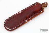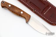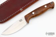 This North Country EDC by Bark River Knives features a satin finished blade with .160" blade stock and 1.101" blade depth, full tang construction. The handle has dark curly maple scales with black liners and a lanyard hole. Comes with a brown leather sheath and original box. Excellent condition.