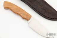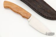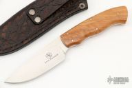 This "Zebra" from the Grazer series by Arno Bernard features a hand rub satin finished drop point blade, .128" blade stock and 1.238" blade depth, full tang construction. The handle has wild olive wood scales. Comes with a brown leather sheath, box, and COA. Excellent condition.