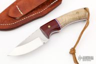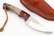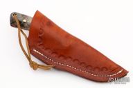 This Skinner by RA Matt features a mirror polished blade with fileworked spine, .157" blade thickness and 1.253" blade depth, full tang construction. The handle has red linen micarta bolsters, wood scales with brass pins and red liners, fileworked tang spine. Comes with a brown leather sheath. Has some light scratches, otherwise excellent condition.