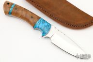 This Hunter by RA Matt features a mirror polished blade with fileworked spine, .173" blade thickness and 1.362" blade depth, full tang construction. The handle has turquoise bolsters, wood scales with mosaic pins and red liners, fileworked tang spine. Comes with a brown leather sheath. Has some light scratches, otherwise excellent condition.