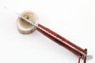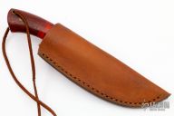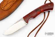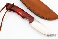 This Hunter by RA Matt features a mirror polished blade with fileworked spine, .155" blade thickness and 1.086" blade depth, full tang construction. The handle has wood scales with acrylic inlays and mosaic pins and red liners, fileworked tang spine. Comes with a brown leather sheath. Has some light scratches, otherwise excellent condition.