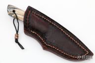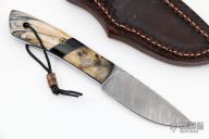 This hunter by RA Matt features a Damascus blade with fileworked spine, .152" blade thickness and 1.079" blade depth, full tang construction. The handle has burl wood bolsters, mammoth tooth scales with mosaic pins and blue liners, fileworked tang spine. Comes with a hand tooled brown leather sheath. Excellent condition.