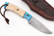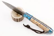This hunter by RA Matt features a Damascus blade with fileworked spine, .151" blade thickness and 1.160" blade depth, full tang construction. The handle has turquoise bolsters, mammoth tooth scales with mosaic pins and black liners, fileworked tang spine. Comes with a hand tooled brown leather sheath. Excellent condition.