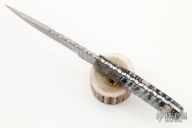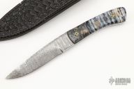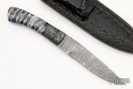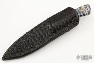 This hunter by RA Matt features a Damascus blade with fileworked spine, .138" blade thickness and .946" blade depth, full tang construction. The handle has burl wood bolsters, mammoth tooth scales with mosaic pins and black liners, fileworked tang spine. Comes with a hand tooled brown leather sheath. Has a little separation on the scales, otherwise good condition.