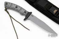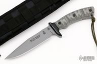 This knife features a grey coated blade with notched thumbrest, .252" blade stock and 1.362" blade depth, full tang construction. The handle has black linen micarta scales with white liners. Comes with a black nylon sheath. Excellent condition.