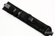 Blade has a black coated and is 1/4" thick and 1 3/8" deep. Full tang construction. Black linen micarta ribbed handle with red liners. Comes with a black nylon sheath. Excellent condition.