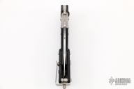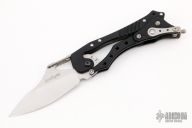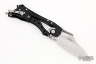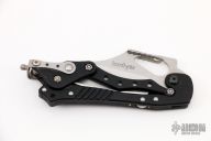 This E.T. (External Toggle) folder by Kershaw is a Grant and Gavin Hawk design, it features a bead blasted blade, black aluminum frame, and the Hawks' external toggle locking mechanism. The knife is very easy to open and close, and simply gripping the handle will keep the blade locked in the open position. There is a knurled roller safety on the spine that can be engaged to prevent partial opening of the blade during carry. Has some scuffs and a couple small dings, otherwise good condition.