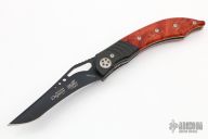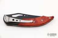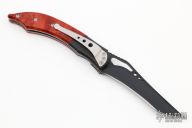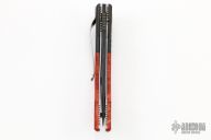 This is a Delta Z Osprey linerlock by Delta Z Knives is a Darrel Ralph design. It features a black tanto recurve blade with thumbhole. The handle has red maple burl scales, black aluminum bolsters, stainless steel liners and tip down clip. Has some light scuffs and scratches, otherwise good user condition.