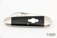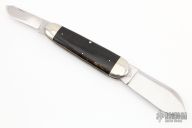 This Wildcatter Knife by Schatt & Morgan features 2 mirror polished blades with nail nicks. The handle has nickel silver bolsters, front and rear, buffalo horn covers with a mother of pearl escutcheon, brass liners and stainless steel springs. Has some light spotting on the main blade, otherwise good condition. Comes with original box and COA that was hand signed by each member of the company at the time.