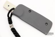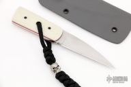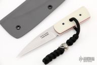 This knife by David Lancaster Clark features a hand rub satin finished blade with .098" blade stock and .777" blade depth, full tang construction with white G-10 scales and red liners. Comes with a kydex sheath. New from maker.