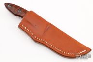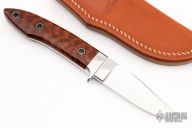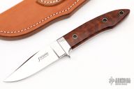 This Utility by John Young features a mirror polished blade with .186" blade stock and .936" blade depth, full tapered tang construction. The handle has a mirror polished stainless guard, snakewood scales and red liners. Lanyard hole at butt. Comes with brown leather sheath. Excellent condition.