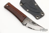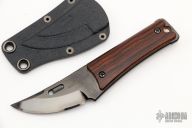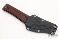 This CHOU by Rockstead features a DLC coated upswept blade with YXR-7 blade steel, false top edge, full tang construction with .149" blade thickness and .860" depth. The handle has ironwood scales.  Includes a kydex sheath.  Light sheathing marks are visible on the blade otherwise the knife is in excellent condition.