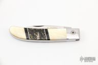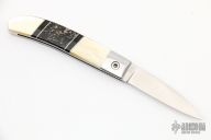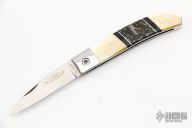 This Loveless City Knife has a satin finished drop point blade with nail nick. Handle has stainless steel bolsters, liners, spring and lanyard hole, gold lip pearl and stone scales. Comes with original box and sheath. Excellent condition.