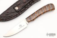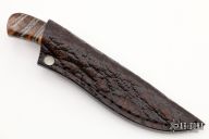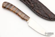 This Hunter by Arno Bernard features a hand rub satin finished drop point blade, .112" blade stock and .832" blade depth, full tang construction. The handle has mammoth molar scales. Comes with a black leather sheath. Excellent Condition.