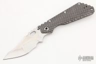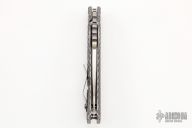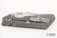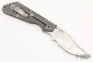 This Mick Strider custom SMF framelock folder has a Nightmare ground blade with notched thumbrest and thumbhole. The handle has a double gunner grip titanium frame with laser engraved titanium clip. Includes Hinderer "Lock Bar Stabilizer" for maximum reverse lock retention. Nice lockup, blade seating and detent. Comes with zippered case. New from maker at the 2022 Friday Night Blade Affair.
