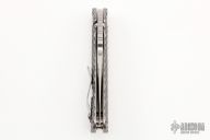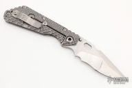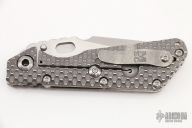 This Mick Strider custom SMF framelock folder has a Nightmare ground blade with notched thumbrest and thumbhole. The handle has a double gunner grip titanium frame with laser engraved titanium clip. Includes Hinderer "Lock Bar Stabilizer" for maximum reverse lock retention. Nice lockup, blade seating and detent. Comes with zippered case. New from maker at the 2022 CCKS.