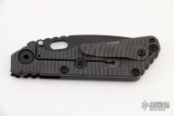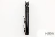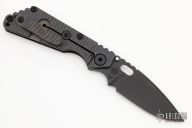 This SNG framelock folder by Mick Strider features a black blade and a dimple pattern black G-10 and flamed titanium frame and tip up titanium clip. Includes a "Lock Bar Stabilizer" for maximum reverse lock retention. Nice detent, lockup and blade seating. New condition.