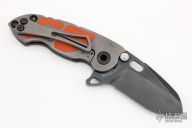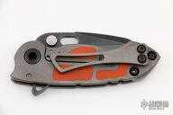 This Mini Solo framelock flipper from Direware Knives features a dark tumble finished blade with a notched thumbrest, thumbhole and flipper. The handle has a bead blast finished titanium frame with orange G-10 inlays, bead blasted titanium pocket clip. Smooth flipping action that requires no wrist movement with an early and strong lock up, nice detent and blade seating is dead center. Tip up or tip down carry. New from maker.