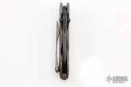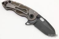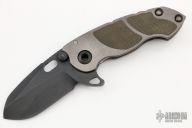 This Mini Solo framelock flipper from Direware Knives features a dark tumble finished blade with a notched thumbrest, thumbhole and flipper. The handle has a bead blast finished titanium frame with green canvas micarta inlays, bead blasted titanium pocket clip. Smooth flipping action that requires no wrist movement with an early and strong lock up, nice detent and blade seating is dead center. Tip up or tip down carry. New from maker.