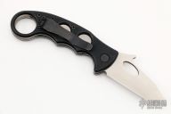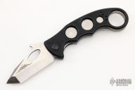 This Custom CQC-7 Karambit linerlock folder by Ernie Emerson features a satin chisel ground tanto blade with notched thumbrest, thumbhole and wave feature. The handle has textured black G-10 scales, titanium liners, standoffs, stainless steel clip, tip up, left or right reversible. Includes the original box and papers. Excellent condition.